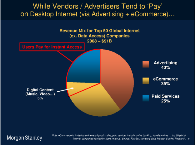 I think we are in the AOL “walled garden” days of the mobile internet. Demand is far outpacing supply, so consumers are paying for digital goods. I don’t pay for news or simple games on the desktop internet because there are so many substitutes that my willingness to pay is driven down to zero.
