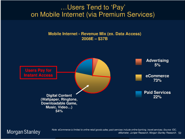What are the arguments that the mobile internet is sustainably different than the desktop internet? One of the main ones I’ve heard is habit: digital goods providers made a mistake in the 90′s by giving stuff away for free. Now people are habituated to free stuff on the desktop internet. Mobile is a chance to start over.