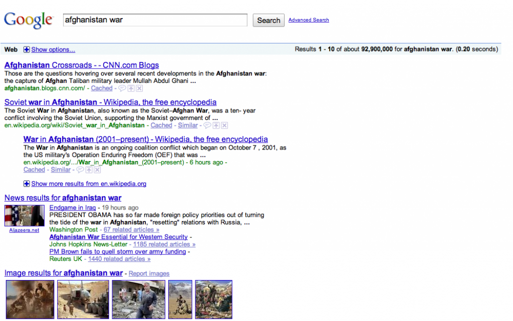 Notice there aren’t any ads on the page. This is because ads for “afghanistan war” generate such low revenues per query that Google doesn’t think it’s worth hurting the user experience with a cluttered page. Google can afford to do this on news queries (along with many other categories of queries) because their real business is selling ads on queries where the user likely has purchasing intent. Big money-making categories include travel, consumer electronics and malpractice lawyers. News queries are loss leaders.
