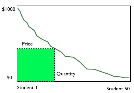 Notice the sections under the curve to the right and above the green box. To the right are students who were willing to pay but were priced out. Those are missed sales opportunities. Above the green box are students who were willing to pay more than you charged. That is lost revenue. (Since the underpricing benefits customers, the area above the green box is called the consumer surplus).
