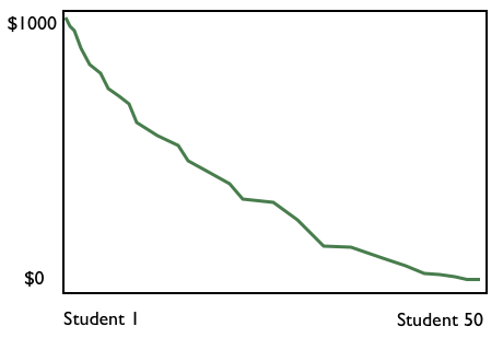 The y-axis is the students’ “willingness-to-pay” and the x-axis is the students sorted from highest to lowest bids. The line is known as the demand curve.