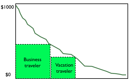 For example, airlines know that business customers will pay more than vacation travelers. They therefore look for acceptable proxies to segment business and vacation travelers and capture more of the area under the demand curve.