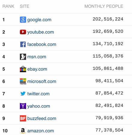 Top 10 websites in the US according to Quantcast:
