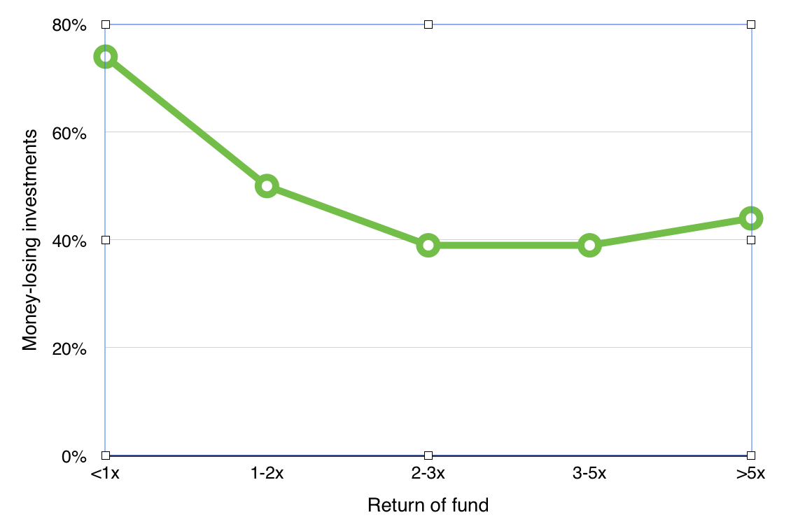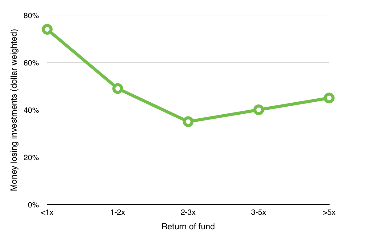 Notice that the curves are U-shaped. It isn’t surprising that the bad funds lose money a lot, or that the good funds lose money less often than the bad funds. What is interesting and perhaps surprising is that the great funds lose money more often than good funds do*.* The best VCs funds truly do exemplify the Babe Ruth effect: they swing hard, and either hit big or miss big. You can’t have grand slams without a lot of strikeouts.