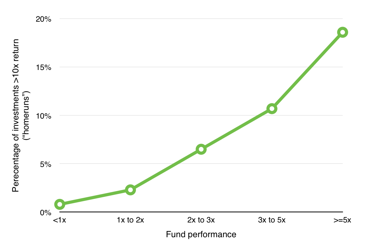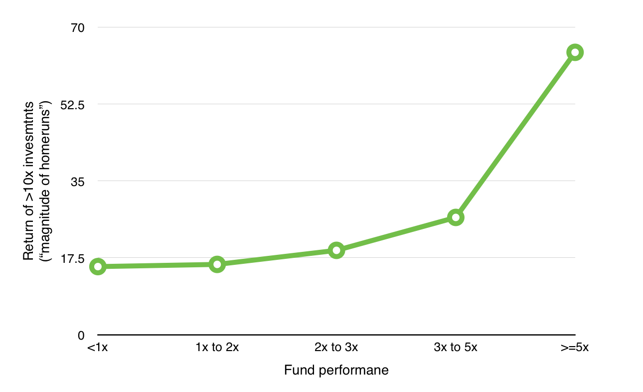 The home runs for good funds are around 20x, but the home runs for great funds are almost 70x. As Bill Gurley says: “Venture capital is not even a home run business. It’s a grand slam business."