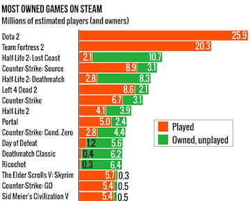 The types of games on Steam vary widely, as do the business models. The most popular game, Dota 2, is free. It makes money selling in-app items, mostly “cosmetic items” that alter the appearance of characters.