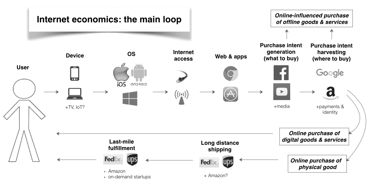 We are living in an era of bundling. The big five consumer tech companies — Google, Apple, Facebook, Amazon, and Microsoft — have moved far beyond their original product lines into all sorts of hardware, software, and services that overlap and compete with one another. But their revenues and profits still depend heavily on external technologies that are outside of their control. One way to visualize these external dependencies is to consider the path of a typical internet session, from the user to some revenue-generating action, and then (in some cases) back again to the user: